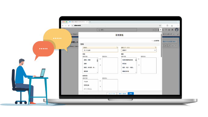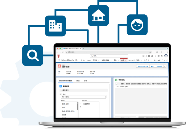 Salesforce上の任意の2オブジェクト間でマッチングが可能。 「人材×案件」「企業×企業」「物件×希望条件」など、業界・業務を問わず利用できます。 GUIベースで設定できるため、現場主導での運用にも最適です。